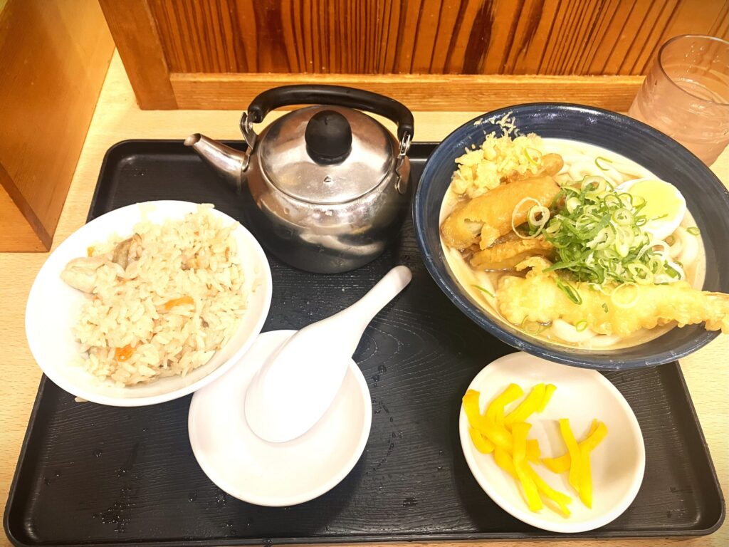 「おいしいどこどり」ミニミニセット(ミニうどん+ミニかしわご飯)があるので、炭水化物×炭水化物でも罪悪感は控えめ。お腹いっぱいになりすぎないのも嬉しいポイントです。